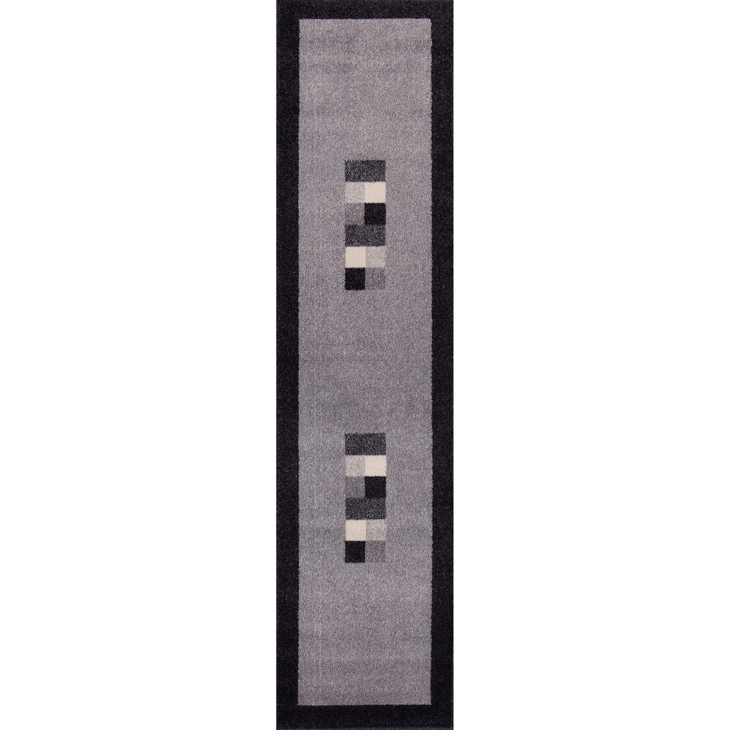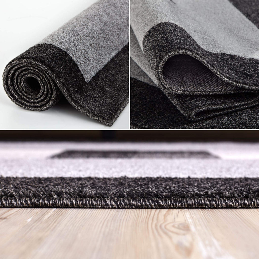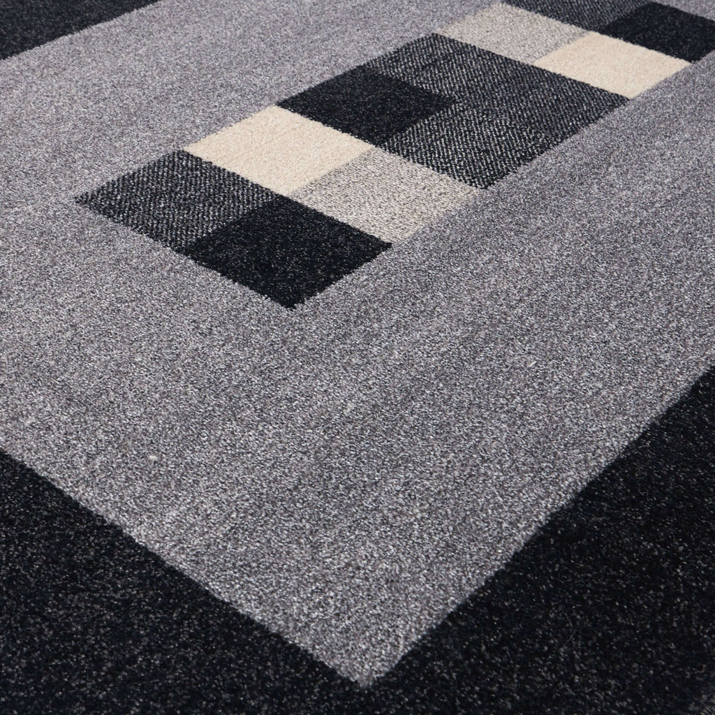 Add a contemporary edge to your home with the Ephesus Grey Black Rug. Its geometric bordered design creates a striking visual focal point while remaining versatile enough to suit any room, from living areas to bedrooms and hallways.