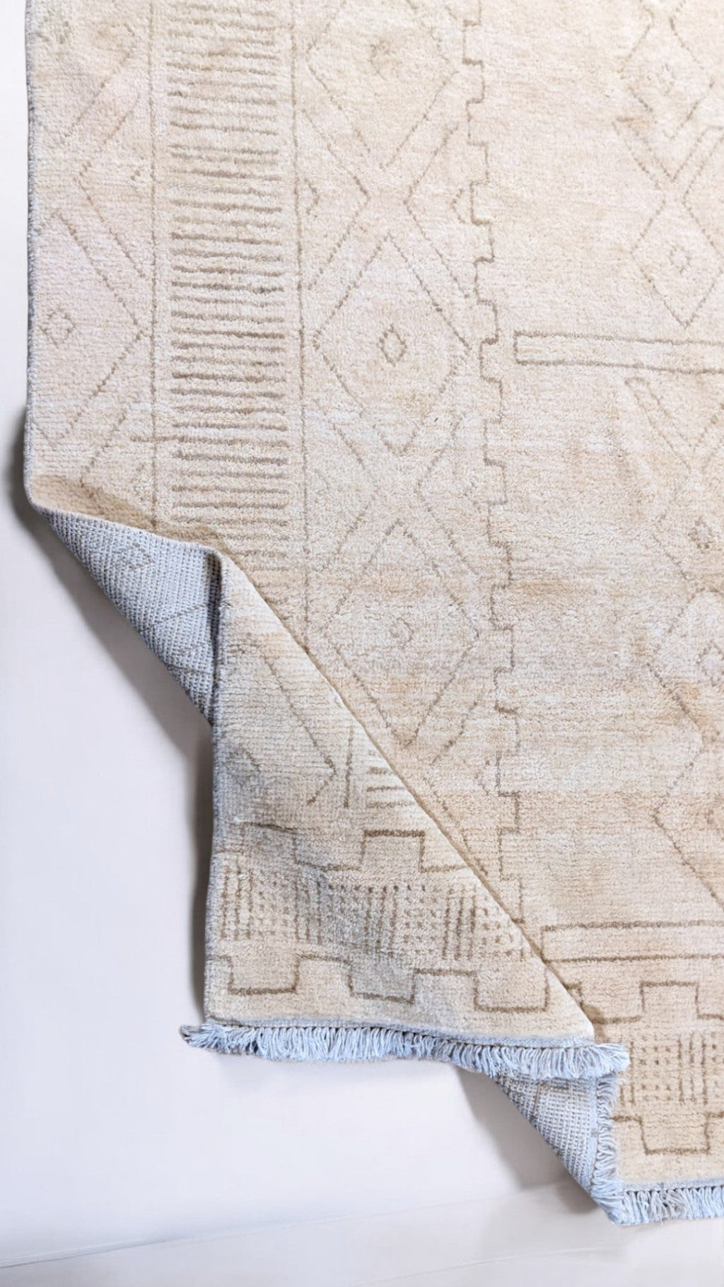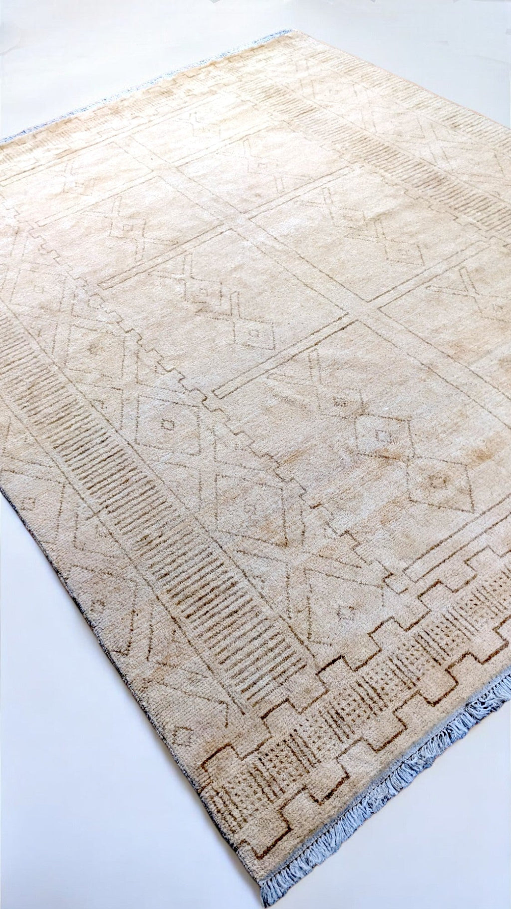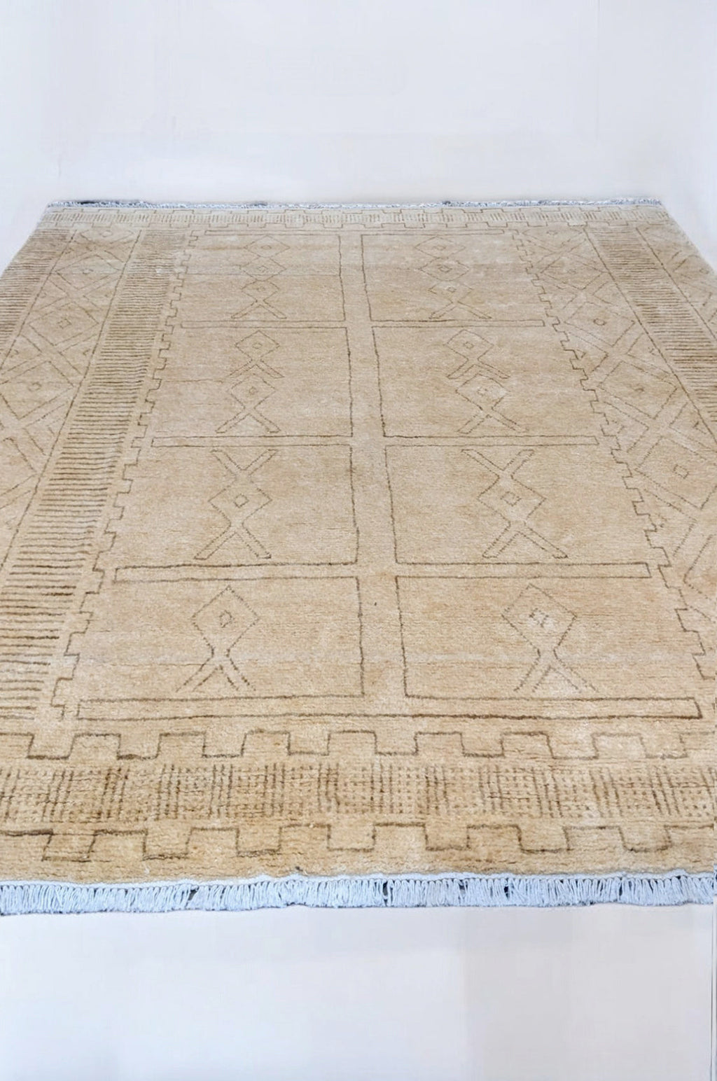 Florea with a beige and brown-toned design influenced by Indo-tribal symbols and Moroccan rug-inspired texture. A core canvas with symmetrical diamond designs perfectly balances history and modernity, while sophisticated rectangles and lines surround the intricate geometric patterns that weave their way over its surface. Crafted from premium wool with a low pile, ideal for contemporary decor.
