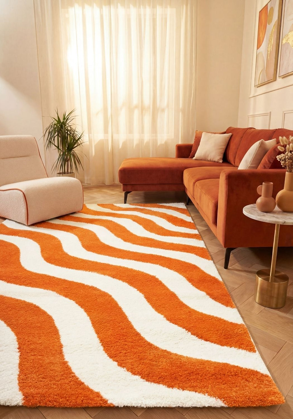 Elevate your interiors with the Joli Wave Orange & White Rug. Its flowing wave-inspired design in vibrant orange and crisp white adds a sense of motion and energy, while the plush pile brings cozy comfort underfoot.