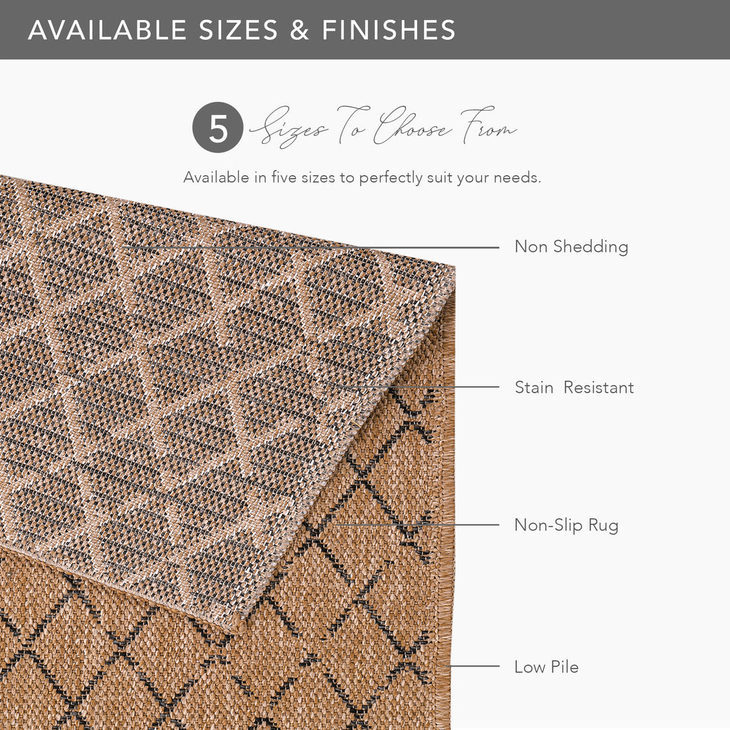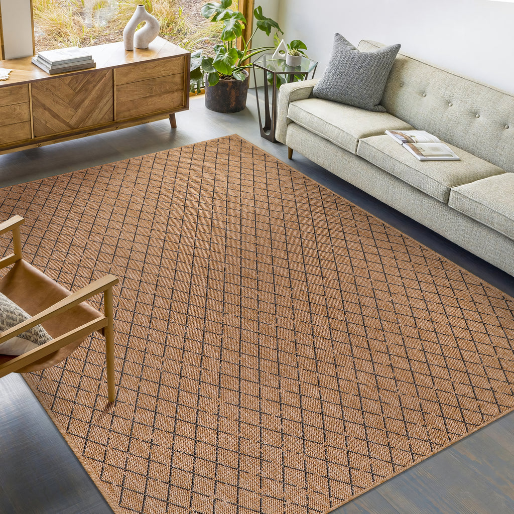 A warm natural jute base is overlaid with black diamond and trellis lines, creating a clean, contemporary geometric look. The contrast lines break up the surface and add interest without overwhelming the room, making this rug ideal for minimalist, industrial and modern décor.