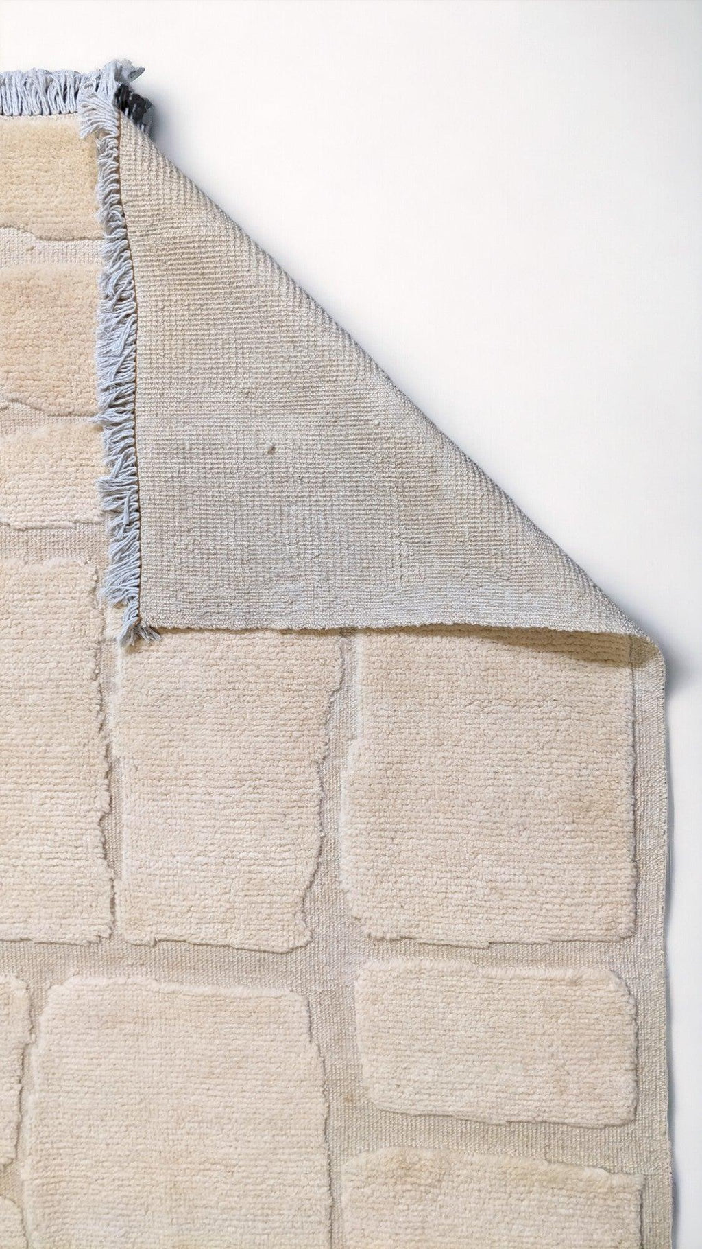 Efficiently crafted and uniquely designed, the Satori abstract Nordic-style rug boasts a splendid cobblestone pattern with a textured feel, a simple geometric pattern with various-sized rectangles arranged in an offset grid, and a neutral colour palette with fringe detailing. Each piece is carefully hand-knotted and carved from premium undyed wool, making it both durable and eco-friendly.