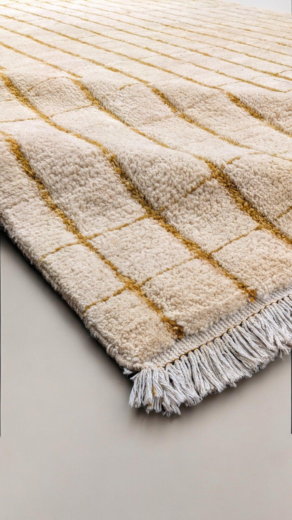 The Stormy Stripe Rug showcases timeless Nordic style with a hand-knotted wool blend. A simple grid pattern in neutral beige and off-white hues creates effortless sophistication, grounding any room with its minimalist, striped design and soothing colour palette.