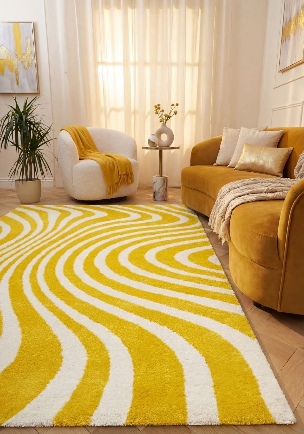 Brighten your interior with the Joli Striped Yellow & White Rug. Designed with flowing striped ripples in fresh yellow and white tones, it creates a lively visual rhythm while the plush surface brings comfort and dimension to your space.