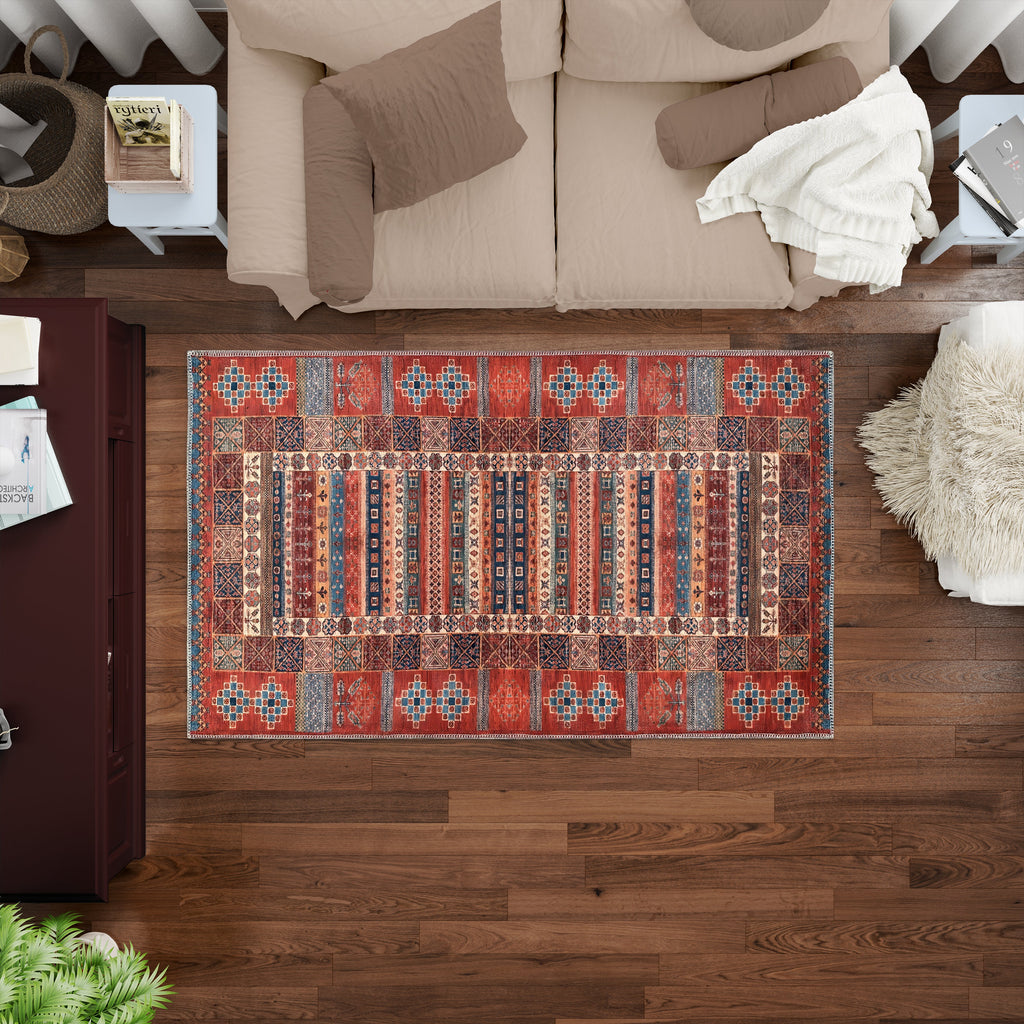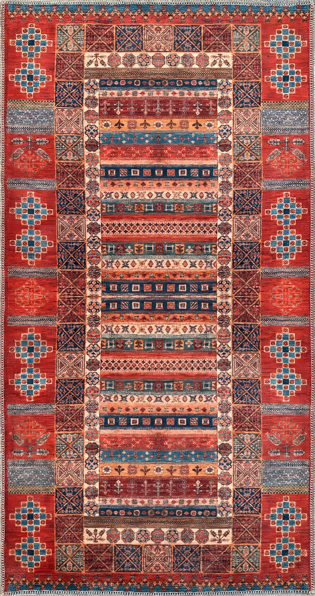 The Netline Home NH1316 Machine Washable Caucasian Tribal Rug is a vibrant celebration of traditional Caucasian weaving artistry, reinterpreted with modern practicality. Its intricate design features bold stripes of geometric motifs, floral bands, and tribal medallions, framed by richly detailed borders in shades of red, blue, ivory, and terracotta.