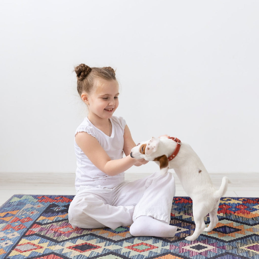 Designed with families in mind, the rug is OEKOTEX certified, pet and child friendly, and exceptionally easy to care for. Unlike traditional kilims, this one is machine washable, making it a perfect fit for busy households.