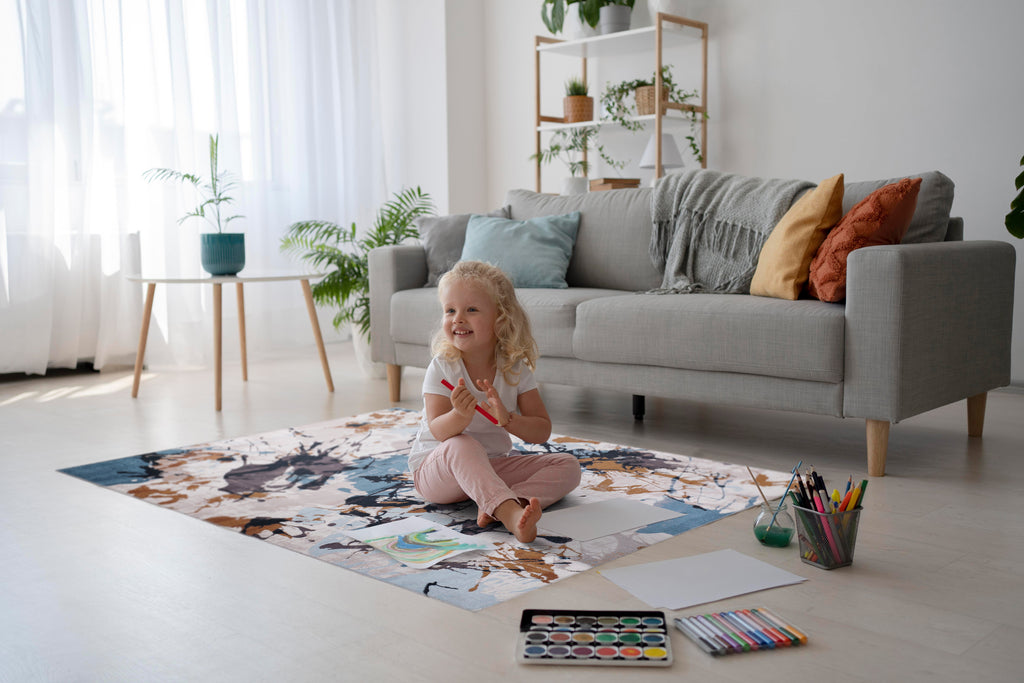 Bring artistic energy to your space with the NL1004 Abstract Splash Rug by Netline Home. Crafted in durable chenille fabric, this machine-washable rug features expressive brushstroke patterns in tones of blue, bronze, grey, and ivory, resembling a modern art canvas. Perfect for adding a bold and sophisticated touch to living rooms, offices, or creative spaces.