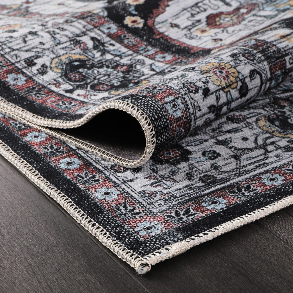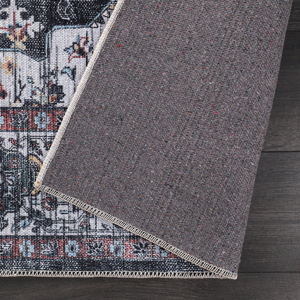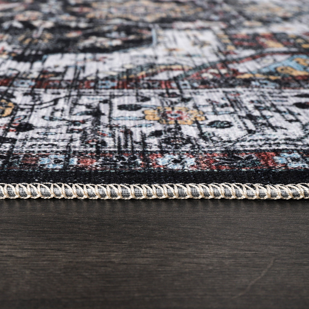 The Netline Home RW1003 Machine Washable Persian Medallion Rug combines timeless Persian artistry with the practicality of modern washable design. Featuring a bold black and white distressed field with intricate medallion detailing and delicate blue and gold accents, this rug adds elegance and sophistication to any room.